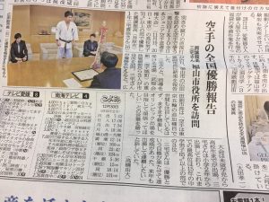 今年の11月19、20日に行われた第10回JKJO空手道選手権大会高校70キロ以上の部にて優勝した三宅貴弥くんとJKJO中国事務局の三宅會長と福山市役所にて副市長と副議長に優勝報告をしてきました!